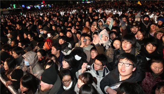 2010년 경인년 (庚寅年) 새해 첫 날인 1일 새벽 종로 보신각에서 타종식이 열린 가운데 시민들이 새해를 맞이하고 있다./사진공동취재단