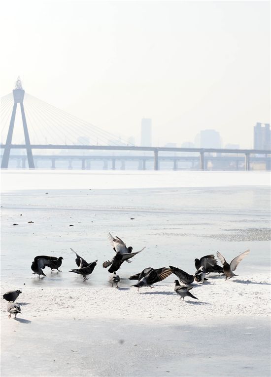 [아시아경제 이재문 기자] 서울지역에 연일 한파가 계속되는 가운데 3일 오후 서울 한강시민공원 광나루지구에 얼어붙은 한강 위로 비둘기들이 먹이를 먹고 있다.