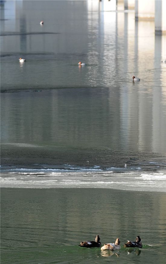 [아시아경제 이재문 기자] 서울지역에 연일 한파가 계속되는 가운데 3일 오후 서울 한강시민공원 광나루지구에 얼어붙은 한강 위로 오리들이 수영을 하고 있다.