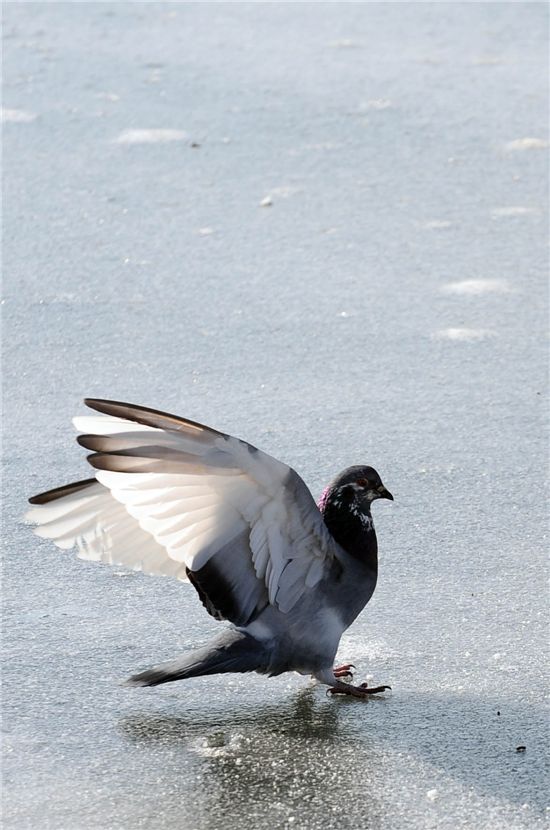 [아시아경제 이재문 기자] 서울지역에 연일 한파가 계속되는 가운데 3일 오후 서울 한강시민공원 광나루지구에 얼어붙은 한강 위로 한 비둘기가 미끄러지고 있다.