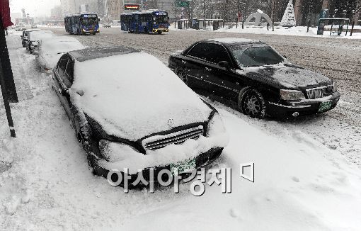 [아시아경제 이재문 기자] 서울 경기지역에 폭설이 내린 가운데 새해 첫 출근인 4일 오전 서울 세종로에서 차량들이 눈에 쌓여있다.