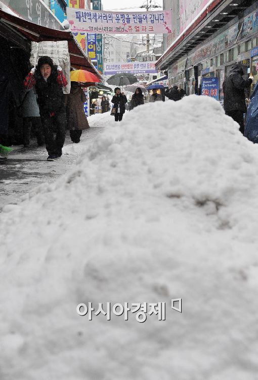 [아시아경제 이재문 기자] 서울 경기지역에 폭설이 내린 가운데 4일 서울 남대문시장에서 상인들이 분주하게 짐을 나르고 있다.