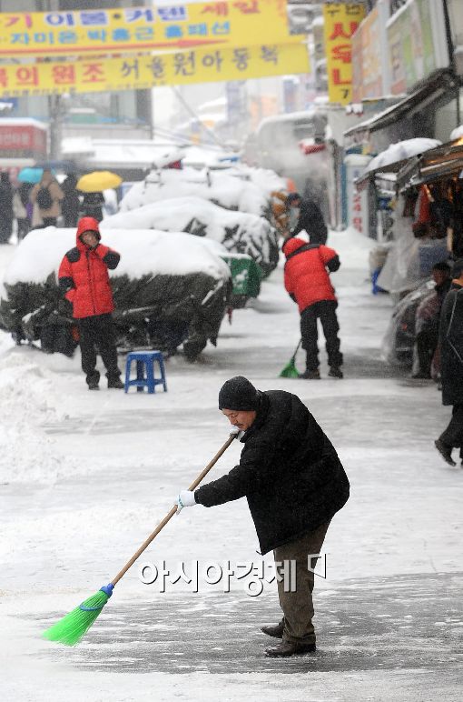 [아시아경제 이재문 기자] 서울 경기지역에 폭설이 내린 가운데 4일 서울 남대문시장에서 상인들이 분주하게 눈을 치우고 있다.