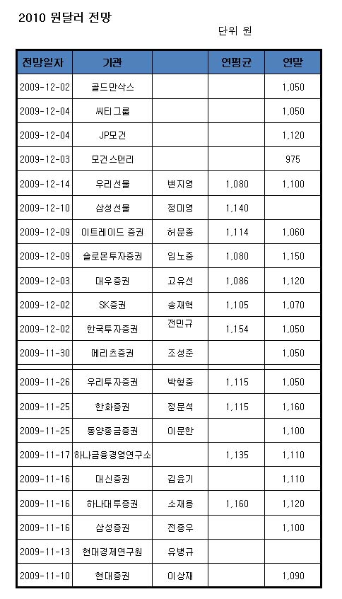 삼성경제연구소는 원·달러 환율이 상반기 1130원에서 하반기 1070원 수준까지 내려갈 것이라면서 달러 캐리트레이드, 미 재정수지 적자 문제, 기축 통화 대체논의 등 달러화 약세 요인이 우세한 가운데 국내에서도 경상 및 자본 수지 흑자로 인한 달러화 공급우위 기조가 지속될 것으로 보이기 때문이라고 설명했다.