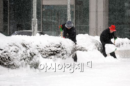 [아시아경제 이재문 기자] 서울 경기지역에 폭설이 내린 가운데 4일 서울 충무로 한 빌딩 관리인들이 눈을 치우고 있다.