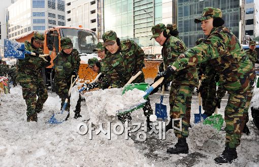 [아시아경제 이재문 기자] 서울에 기상관측이 시작된 이래 가장 많은 눈이 내린 4일 오후 수도방위사령부 장병들이 서울 명동에서 제설 작전을 펼치고 있다.