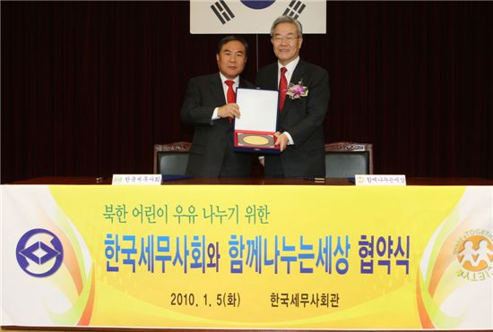 [아시아경제 조영주 기자] 한국세무사회는 5일 납북평화재단 '함께나누는세상'과 협약을 맺고 영양결핍 상태가 심각한 북한 어린이에게 우유 보내는 운동에 적극 나선다.