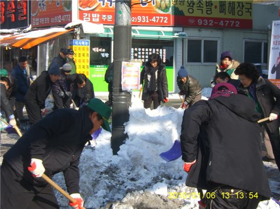 6일 상계1동 소속 직능단체 회원 100여명이 오후 1시부터 오후 4시까지 수락산역과 상계1동 노원골 디자인서울거리(길이 580m, 폭 25m)에서 제설작업을 벌였다.