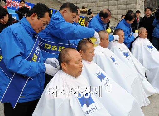[아시아경제 윤동주 기자] 정부의 세종시 수정안에 대해 반발하며 전면 투쟁을 선언한 자유선진당 일부 의원들이 11일 서울 여의도 국회 본청앞에서 삭발식을 갖고 있다.