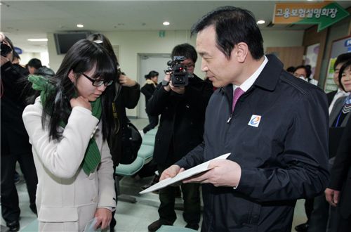 [아시아경제 장용석 기자] 임태희 노동부 장관이 12일 오후 경기 수원 종합고용지원센터를 방문, 명예 일일 상담원으로서 외국인 고용서비스와 관련한 현장 상담을 진행하는 등 구직자들을 격려하고 있다.
