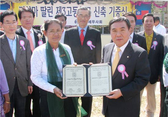 $pos="C";$title="";$txt="조용근 한국세무사회 회장(오른쪽)이 13일 오전 미얀마 양곤의 딸린 제3고등학교 다우민민기 교장에게 '사랑의 학교' 기증서를 전달하고 있다.