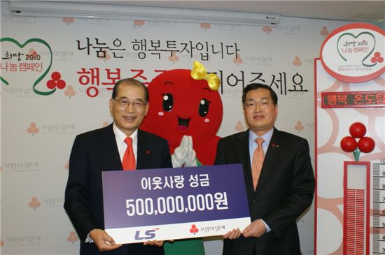 [아시아경제 김정민 기자]LS그룹(회장 구자홍)은 13일 불우이웃돕기성금 5억원을 사회복지공동모금회에 기탁하고, 계열사별로 복지시설 등을 방문하여 자원봉사활동을 적극 펼치기로 했다.