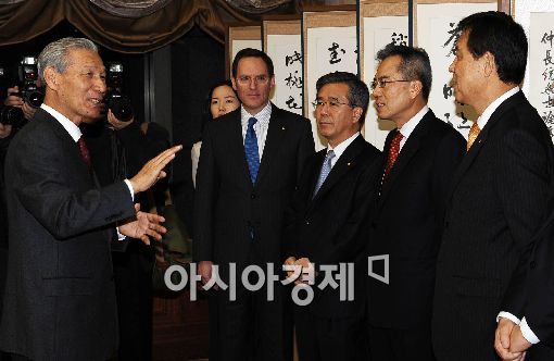 [아시아경제 이재문 기자] 이성태 한국은행 총재가 15일 오전 서울 소공동 한국은행에서 열린 금융협의회에서 시중은행장들과 대화를 나누고 있다.