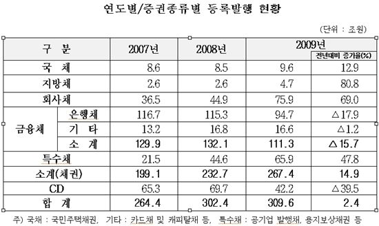 17일 한국예탁결제원(이하 예탁원)에 따르면 2009년 한해 동안 한국예탁결제원의 등록발행시스템을 통해 조달된 채권 등 자금조달규모는 310조원으로 전년의 302조원보다 2.4% 증가한 것으로 집계됐다.