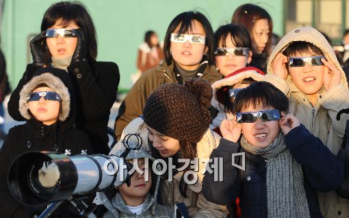 [아시아경제 이재문 기자] 부분일식이 전국에서 관측된 가운데 15일 오후 서울 종로 서울과학관에서 어린이들과 학부모가 일식관측키트를 쓰고 우주쇼를 관람하고 있다.