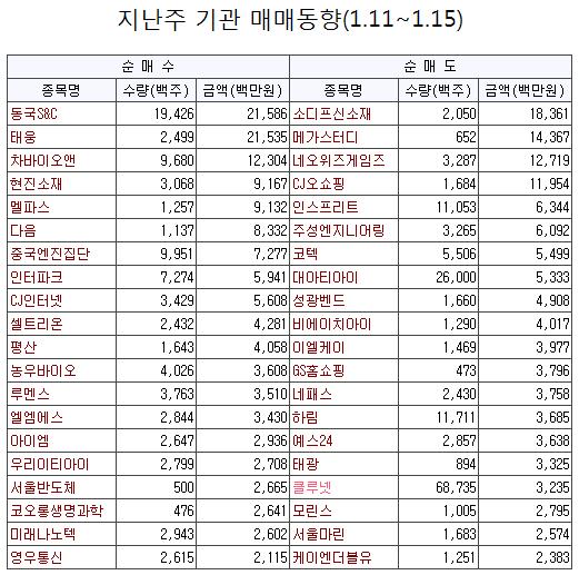 지난 한 주 동안 기관은 동국S&C와 태웅을 각각 216억원, 215억원 순매수했다. 이어 차바이오앤(123억원 순매수)과 현진소재(92억원), 멜파스(91억원), 다음(83억원), 중국엔진집단(73억원) 등을 집중적으로 사들였다.
