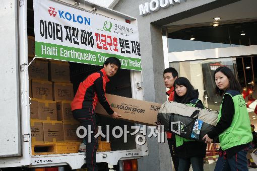 [아시아경제 김현정 기자] 17일 코오롱그룹이 아이티 지진 피해민들에게 쉼터를 제공하기 위해 전국 매장에서 모은 코오롱스포츠 텐트 150여동을 국제구호개발NGO 굿네이버스 측에 전달했다. 사진은 굿네이버스 측에 전달하기 위해 서울 반포동 코오롱스포츠 컬쳐스테이션에서 텐트를 이동하는 모습.