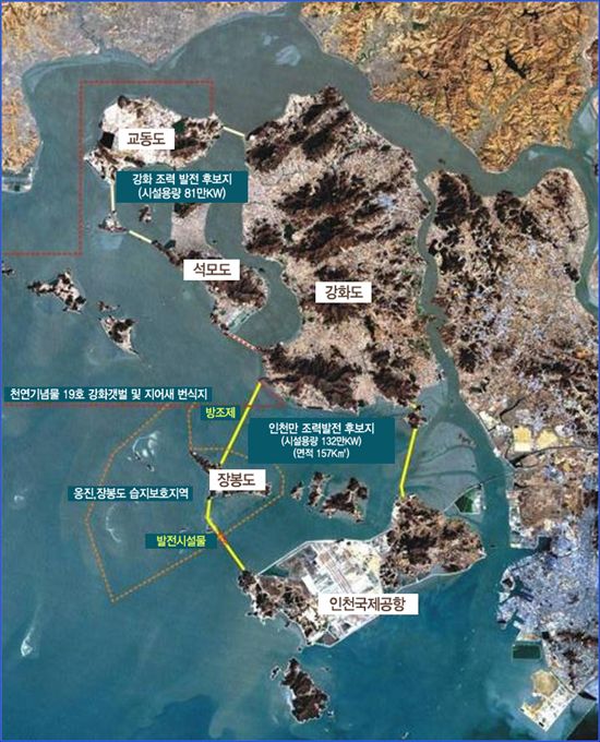 인천만 조력발전소 건설사업은 인천광역시 강화도 남부와 옹진군의 장봉도, 용유도, 삼목도 및 영종도로 둘러싸인 해역 일원에 들어서는 시설용량 132만KW규모의 발전소를 건설하는 공사다. 현재 건설중인 신고리 원자력발전소 1기(100만kW)의 건설규모를 넘어선다.