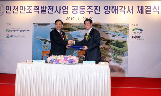 한국수력원자력과 GS건설은 20일 '인천만 조력발전소 건설사업 공동추진 양해각서'를 체결하고 세계 최대 규모의 조력발전소 건설사업에 진출한다고 밝혔다.