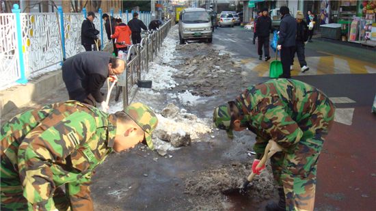 구는 지난 폭설에 민·관·군이 합동으로 교통에 혼잡을 주는 간선도로는 말끔하게 눈을 치웠으나 이면도로 등 골목길 구석에 모아둔 잔설이 얼어붙어 있는 데다 쓰레기까지 무단투기 되는 바람에 도시미관과 주민안전을 해친다고 판단, 구청과 16개 동 주민센터가 모두 나서서 잔설제거 작업을 펼쳤다.