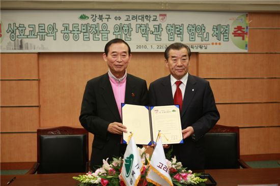 강북구는 1999년 3월 서울산업대와 첫 관·학 협력 체결을 맺은 이래 성신여대 덕성여대 산업대 서울사이버대 광운대 신흥대 등 총 8개 대학과 각종 협력 사업을 진행하고 있으며 이번 고려대학과는 9번째로 MOU(양해각서)를 체결, 지역과 대학 공동의 발전을 모색하게 된다.