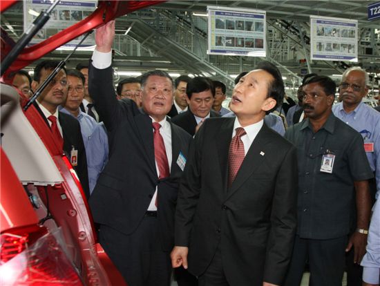 $pos="C";$title="";$txt="";$size="550,414,0";$no="2010012419164853395_1.jpg";@include $libDir . "/image_check.php";?>[아시아경제 손현진 기자]이명박 대통령은 24일(현지시간) 신흥시장 공략의 첨병역할을 하고 있는 현대자동차 인도 공장을 방문해 정몽구 회장으로부터 회사현황을 보고 받은 후 생산현장을 시찰하고 인도 공장 임직원들을 격려했다.
