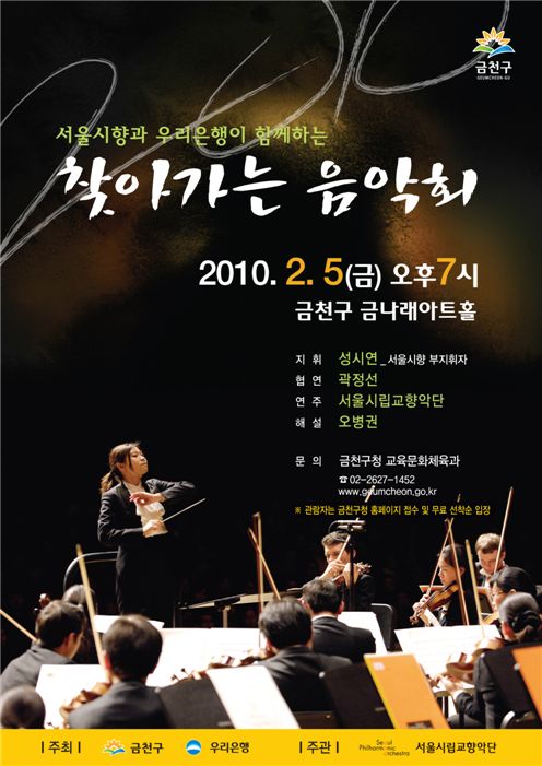 금천구와 우리은행이 주최하고 서울시립교향악단(이하 서울시향)이 주관, 개최하는 이번 음악회에서는 서울시향 바순 수석인 곽정선의 협연으로 모차르트의 바순 협주곡 K.191과 슈베르트의 교향곡 8번 '미완성'을 공연할 예정이다.
