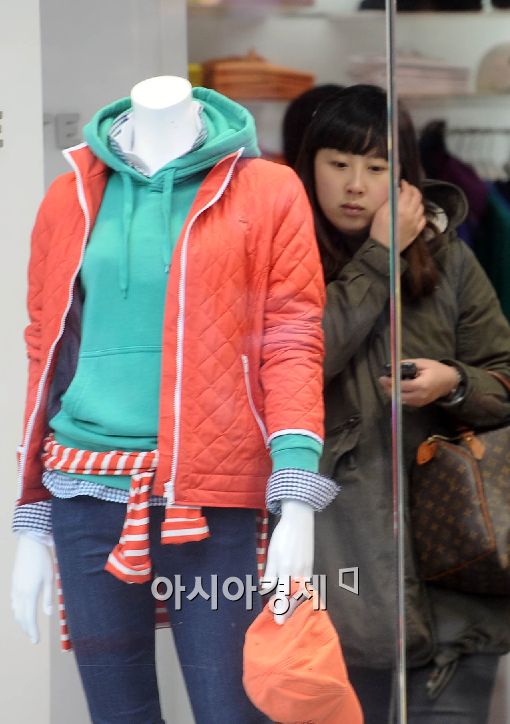 [아시아경제 이재문 기자] 서울의 한낮 기온이 영상을 회복한 가운데 26일 오후 서울 명동을 찾은 시민들이 화려한 봄옷으로 갈아입은 쇼윈도 마네킹을 보고 있다.