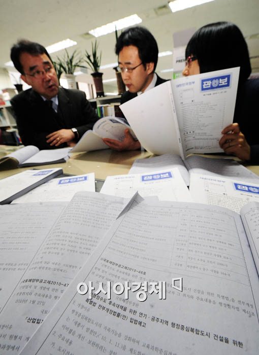[아시아경제 윤동주 기자] 세종시 수정안을 입법하기 위한 절차에 들어간 가운데 27일 오전 서울 세종로 중앙청사 행정안전부 규제개혁법무담당관 공무원들이 세종시 수정안이 실린 관보를 살펴보고 있다.