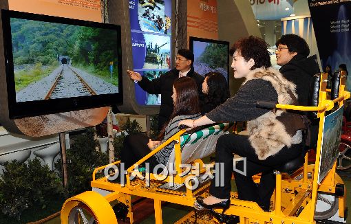 [아시아경제 이재문 기자] 27일 오전 서울 삼성동 코엑스에서 열린 '2010 내나라 여행박람회'를 찾은 시민들이 강원도정선의 레일바이크를 체험하고 있다.