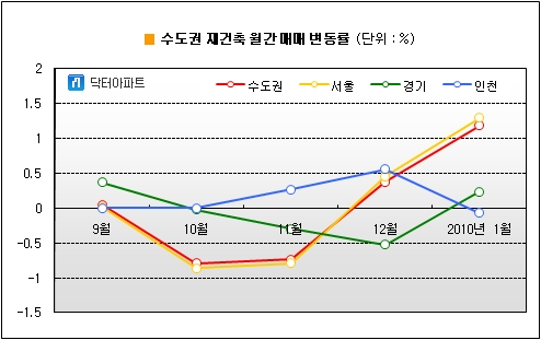 28일 부동산정보업체 닥터아파트에 따르면 수도권 재건축 아파트 1월(지난 1일~26일 현재) 매매변동률은 1.19% 상승을 기록한 것으로 조사됐다. 이는 DTI규제 이전인 8월(1.64%) 이후 가장 높은 수치며, 작년 12월 0.38%보다 0.81%포인트 상승한 것이다.