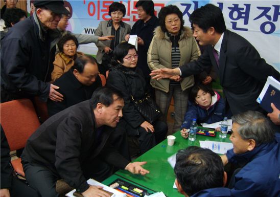 $pos="C";$title="";$txt="27일 오전 이재오 국민권익위원장(우측)이 익산시청에서 현장민원상담을 벌이고 있는 가운데 모현동 아파트 재개발 일부 주민들이 몰려들어 격렬하게 삿대질을 하며 고충을 호소하자 이한수 익산시장이 일어서서 시민들을 진정시키고 있다. ";$size="548,385,0";$no="2010012808355692744_1.jpg";@include $libDir . "/image_check.php";?>[아시아경제 박현준 기자] 이재오 국민권익위원장이 전국의 민원현장을 가는 곳마다 현지 고충민원이 봇물을 이뤘다.