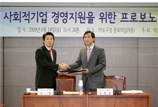 이밖에도 지난해 6월에는 서울시내 자치구중 최초로 사회적 기업 전문컨설팅 그룹인 SCG (Social Consulting Group)와 프로보노(pro bono,‘공익을 위하여’라는 뜻의 라틴어로 다양한 분야의 전문가들이 공익을 위해 무료 봉사하는 것)협약을 맺어 경영 회계 마케팅 등 다양한 분야의 전문가들이 마포구에 있는 사회적 기업의 자생력을 키우기 위한 경영 전략을 컨설팅 해주고 있다.
