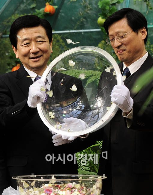 행사에 참석한 이원효(오른쪽) 서울대공원 원장과 박윤배 부평구청장등 참석자들이 나비를 날리며 협약식을 기념하고 있다.