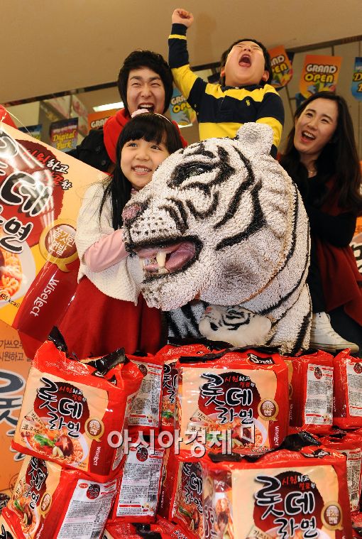 [아시아경제 이재문 기자] 롯데마트가 31일 오전 서울역점에서 37년만에 '롯데' 이름이 붙은 '롯데라면'을 선보이고 있다.