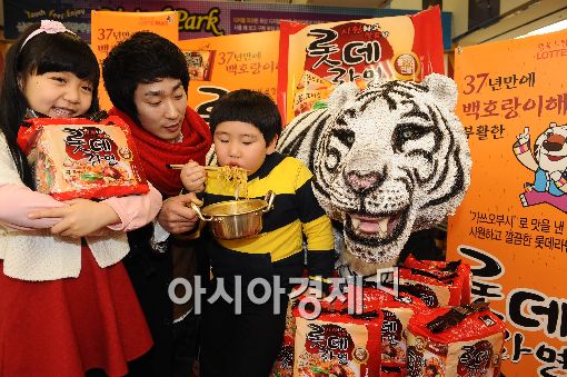 [아시아경제 이재문 기자] 롯데마트가 31일 오전 서울역점에서 37년만에 '롯데' 이름이 붙은 '롯데라면'을 선보이고 있다.
