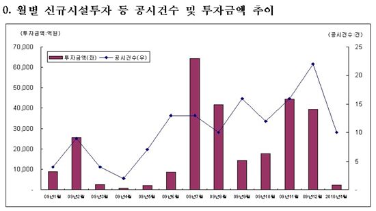이번 조사는 지난해 1월2일부터 12월31일까지 유가증권 및 코스닥시장 신규시설투자 등 공시 현황을 전년 동기와 비교해 월별 추이를 분석한 결과며 자회사·자진 공시 등은 제외됐다.