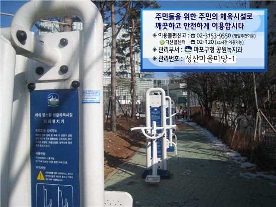 마포구(구청장 신영섭)가 지역내 모든 야외 헬스형 체육시설에 고유번호를 부여한 ‘불편신고 스티커제’를 시행해 주민들의 좋은 반응을 얻고 있다.
