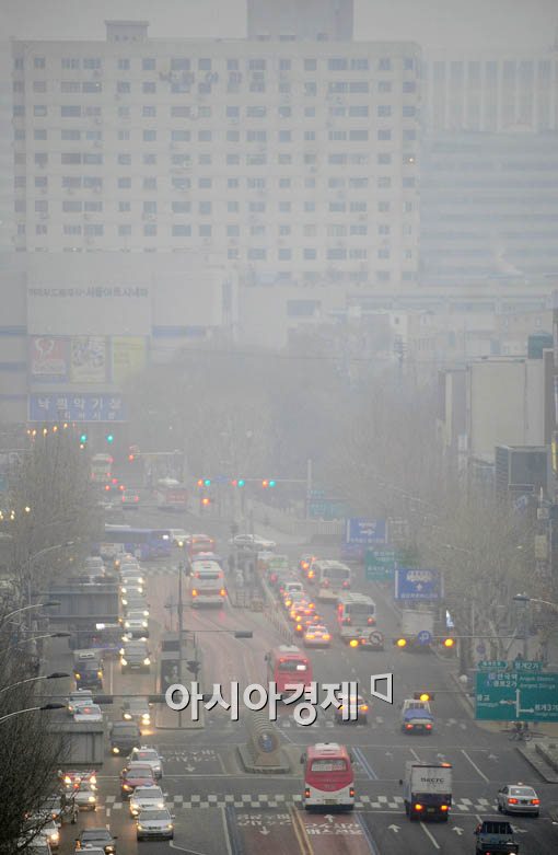 [아시아경제 윤동주 기자] 서울과 경기지역에 짙은 안개가 낀 1일 오전 서울 도심길에 차량들이 전조등을 낀체 조심운전을 하고 있다.