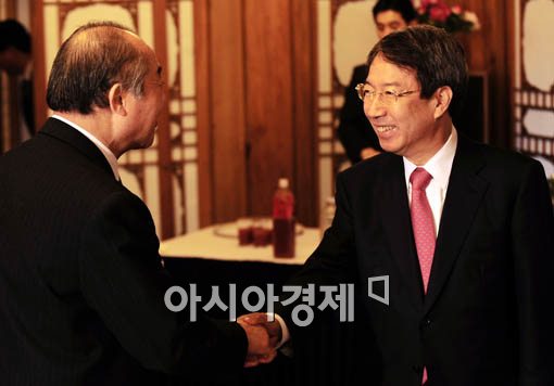[아시아경제 윤동주 기자] 1일 서울 삼청동 총리공관에서 열린 세종시민관합동위원회에 참석한 정운찬 국무총리가 송석구 민관위원장과 인사를 나누고 있다.