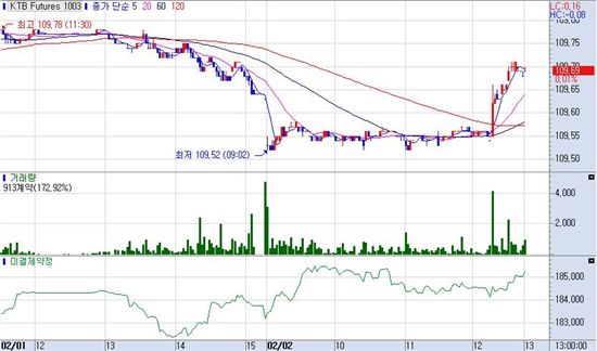 2일 오후 1시현재 채권선물시장에서 3월만기 3년물 국채선물은 전장대비 6틱 상승한 109.69로 거래중이다. 이날 국채선물은 10틱 떨어진 109.53에 개장해 109.52까지 떨어지며 지지부진한 모습을 보인바 있다. 증권이 4353계약을 은행이 1288계약을 순매수하고 있다. 반면 외국인이 4989계약 순매도를 기록중이다.