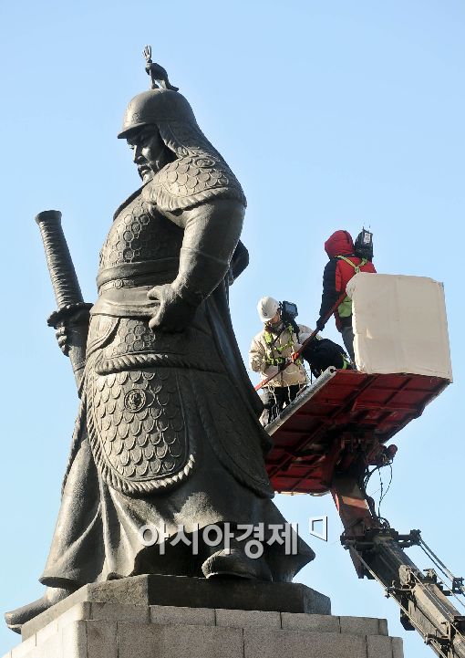 [아시아경제 이재문 기자] 2일 오후 서울 광화문광장의 충무공 이순신 장군 동상에 최첨단 산업용 내시경 카메라를 이용한 내시경 정밀검사가 진행되고 있다. 이번 내시경 검사는 건립 40여 년이 지난 충무공 동상이 작년 10월 광화문광장에 새로 들어선 세종대왕 동상의 화려한 외관에 비해 초라해 보인다는 의견에 따라 실시됐다.