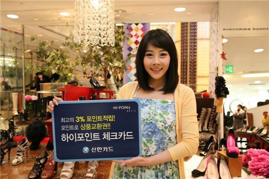 $pos="L";$title="";$txt="신한카드 하이포인트 체크카드";$size="550,366,0";$no="2010020309005831100_1.jpg";@include $libDir . "/image_check.php";?>특별적립처인 백화점(롯데ㆍ현대)과 홈쇼핑(CJ오쇼핑), 온라인몰(CJmall), 이동통신(SKTㆍKTㆍLGT), 해외가맹점 등에서는 전월 이용 금액에 따라 20만원 미만이면 0.1%를, 20만원 이상~50만원 미만이면 0.5%를, 50만원 이상~80만원 미만이면 1.0%를 포인트로 받을 수 있다. 또 80만원 이상~150만원 미만 사용하면 1.5%, 150만원 이상일 경우 3%의 포인트를 적립해 준다.