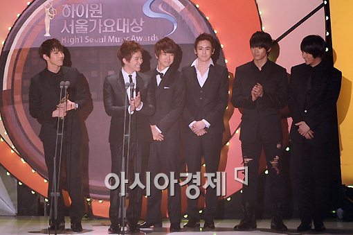 [아시아경제 이기범 기자]2PM이 3일 오후 서울 방이동 올림픽공원 펜싱경기장에서 열린 '제 19회 하이원 서울가요대상'에서 인기상을 수상해 소감을 말하고 있다.