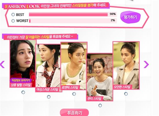 실제로 극 중 이민정이 입었던 의상은 방송 후 게시판에 문의가 쇄도하고, 제품이 매진되기도 해 그에게 ‘완판녀’라는 닉네임이 붙을 정도다.