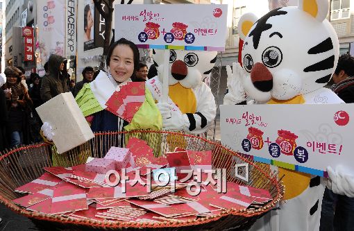 [아시아경제 이재문 기자] 비씨카드가 민족 대명절 설을 앞두고 5일 오후 서울 명동거리에서 시민들을 대상으로 ‘福 나눔’ 야외 이벤트를 진행하고 있다. 福 나눔 이벤트는 행사부스를 방문한 고객들에게 세뱃돈 봉투를 증정하며 봉투안에는 LED TV, 기프트카드 등 다양한 경품교환권이 들어있다.
