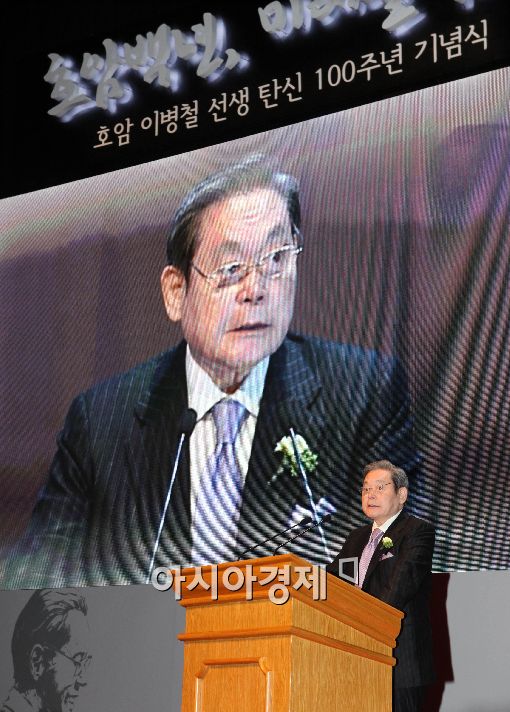 [아시아경제 이재문 기자] 고(故) 이병철 삼성그룹 선대회장의 탄생 100주년을 기리는 기념식이 5일 서울 중구 호암아트홀에서 열렸다. 이건희 전 삼성그룹회장이 기념식장에서 가족대표로 인사말을 하고 있다.