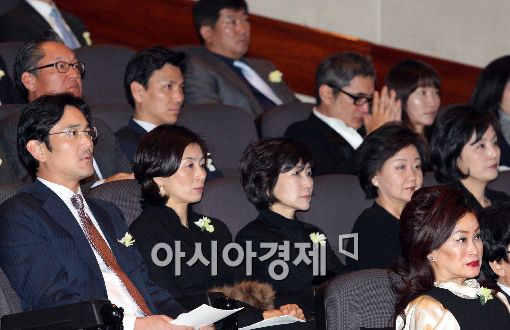[아시아경제 이재문 기자] 고(故) 이병철 삼성그룹 선대회장의 탄생 100주년을 기리는 기념식이 5일 서울 중구 호암아트홀에서 열렸다. 이건희 전 삼성그룹회장의 아들 이재용 부사장이 이건희 전 회장의 인사말을 경청하고 있다.