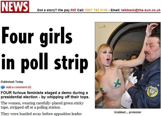 8일 영국 타블로이드 신문 더 선 등 외신들에 따르면 반라의 시위 여성들은 여권운동단체 ‘페멘’ 소속으로 야당 후보인 빅토르 야누코비치(59) 전 총리가 투표소에 나타나기 전 경비원들에게 붙들려 해산됐다.