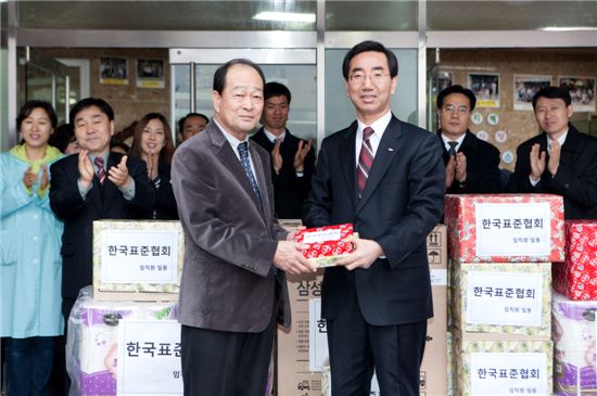 최갑홍 한국표준협회 회장(사진 오른쪽)은 9일 사회복지법인 혜성원(이사장 이창욱)을 방문, 세탁기를 비롯한 생필품 및 금일봉을 각각 전달하고 원생들을 격려하였다. 혜성원은 지적장애인과 지체장애인 150여 명이 생활하고 있다.